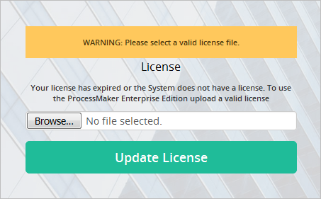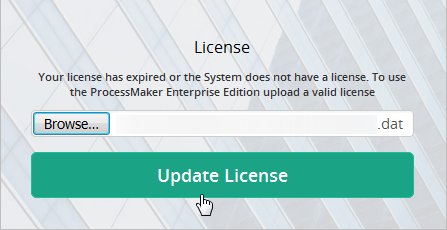 Click on Browse and select the .dat license file that was purchased from the ProcessMaker Sales Department. Then, click the Update License button.