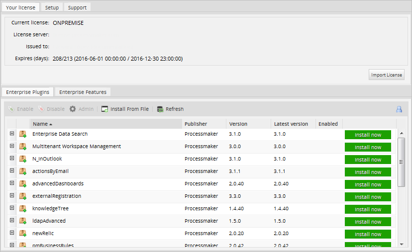 The ProcessMaker Enterprise Edition adds a series of proprietary plugins and 16 Enterprise features. Like the open source core, all the source code for the Enterprise Edition plugins can be viewed; however, the shared source license does not allow the plugin code to be changed or redistributed. For custom plugins, see Plugins.
