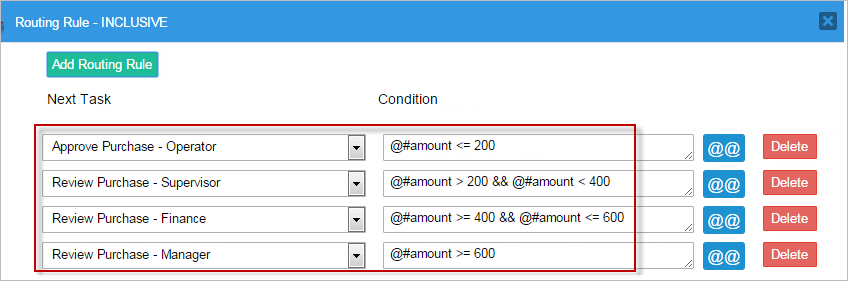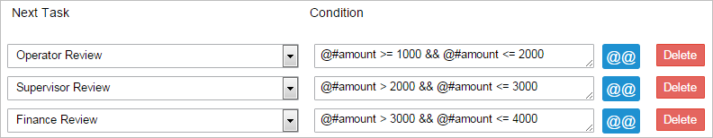 • If the amount is greater than $2000 and less than or equal to $3000, then the Supervisor will review the case. The condition in the routing rule will be: @#amount > 2000 && @#amount <= 3000.