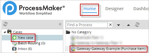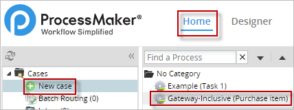 All configurations needed for this example to work properly have been made. Next, run a case to test every condition added to the routing rule of the inclusive gateway. To run a case, go to Home > New Case and double click on the name of the process.