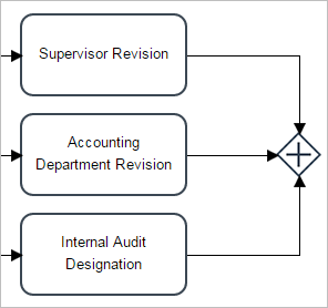 • Converging: A Converging Gateway allows the synchronization of multiple branches. It should have two or more incoming connections and one outgoing connection path.