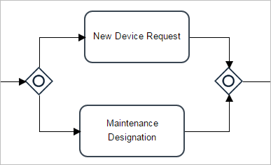 When the execution of the process arrives at the first gateway, it will route the flow to "Maintenance Designation" and/or "New Device Request", depending on whether their conditions evaluate to TRUE or FALSE. If both are TRUE, then two cases will appear in the inbox. Only after completing both parallel tasks (it doesn't matter which is completed first), the two parallel paths will merge at the converging inclusive gateway, and then the process will move onto the "Operation Send" task.