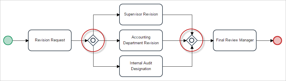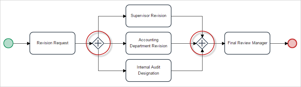 Note: Take into consideration that when including gateways in a process, the order of opening and closing gateways must be respected. The mathematical rules governing brackets are a good example of the expected behavior of gateways. If a set of parenthesis was opened, it must be closed in the right order. Parent parenthesis cannot be closed without first closing all the child parenthesis.