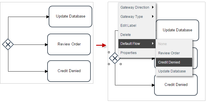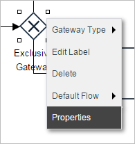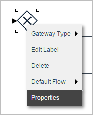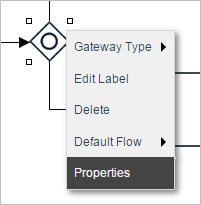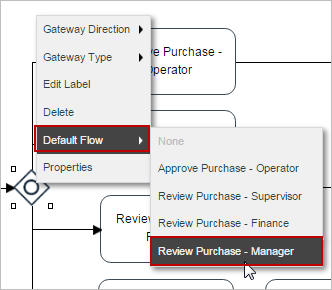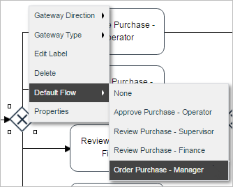 To set the default flow, first right click on the gateway and select the Default Flow option and choose an element. Then, add the necessary conditions to the other tasks inside the gateway properties. Take into account that this option is enabled in the gateway context menu only when the gateway has routing rules established in the design (when the gateway is connected to other elements in the design).