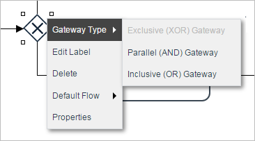 The type of gateway can also be changed by right clicking and selecting the Type option from the gateway context menu. Select any of the three types and the gateway will be changed to the selected one.