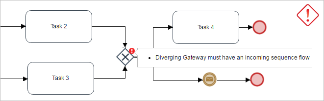 • A gateway cannot be diverging and converging at the same time. This practice is only supported in notation. Moreover, the ProcessMaker designer does not support it. The Process Validator warns against this design error with a message.