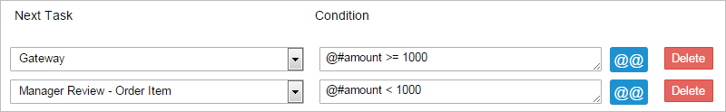 • If the amount is less than $1000, then it will go directly into the final task where the Manager can approve/disapprove the order of the item. The condition in the routing rule will be: @#amount < 1000.