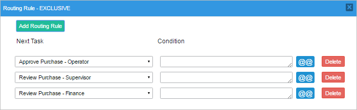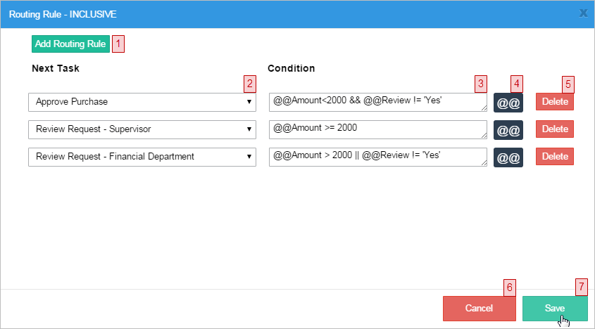 • If the amount is greater than $3000 and less than or equal to $4000, then Finance will review the case. The condition in the routing rule will be: @#amount > 3000 && @#amount <= 4000.