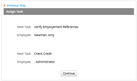 "Verify Employment References" and "Check Credit" will appear as two separate cases in the assigned users' inboxes. The two different tasks must be completed by their assigned users before the case goes to the next task. There is no special order in which they need to be completed. In the example, both tasks must be completed in order to continue to the task "Evaluate Application", otherwise this last task won't appear in the user's inbox.