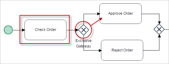 In the example below, the first task “Check order” will be connected to an exclusive gateway that will select between the tasks "Approve Order" and "Reject Order" depending on the documentation provided by the requester of a credit loan. The DynaForm assigned to the task has a radio (group) field where the reviewer will choose "Yes" or "No", and the value will be saved in the variable @@DocumentationReview, which is related to the field.