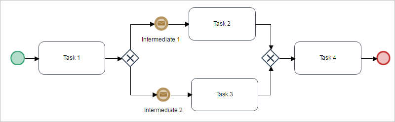 An Exclusive, Inclusive or Parallel Gateway can used along with an Intermediate Event. An example on how these elements work together will be explained next. Connect a start event with a task and then add a gateway (exclusive, inclusive or parallel) and connect it to two intermediate events.