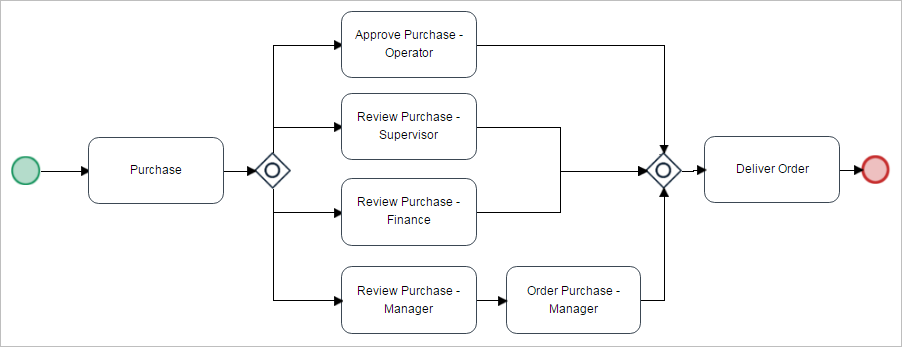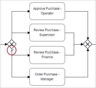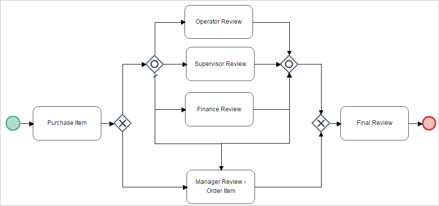 Begin by creating a start event, connect it to the first task ("Purchase item"), then add an inclusive gateway that will select one path among four tasks (because of the conditions in the gateway): "Approve Purchase - Operator", "Review Purchase - Supervisor", "Review Purchase - Finance" and "Review Purchase - Manager". Connect the "Review Purchase - Manager" task directly to the "Order Purchase - Manager" task. Add an inclusive gateway to converge all the threads leading from the "Approve Purchase - Operator", "Review Purchase - Supervisor", "Review Purchase - Finance" and "Order Purchase - Manager" tasks. Right click on the first inclusive gateway and set the default flow of the gateway to the task "Review Purchase - Manager", in case none of the conditions are True. That is why the "Review Purchase - Manager" task will directly approve the purchase and finish the process. Finally, connect the second gateway to the task "Order Purchase - Manager". The image below shows what the process should look like.