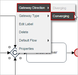 After a gateway has been added to the Process Map, its direction will automatically be selected depending on how many connections it has. When a gateway has one input flow and several output flows then it will automatically be a "Converging" type gateway. But if a gateway has several input flows and only one output flow then it will automatically be a "Diverging" type gateway.