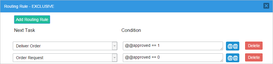 Note: If several conditions in the gateway use the same variable, make sure that conditions higher in the list do not exclude conditions lower in the list. For example, an exclusive gateway has the following routing rules and their conditions: