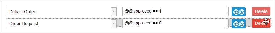 To drag and drop a condition, locate the mouse near the Delete button or between the Next Task and Condition fields. Click and do not release the mouse.