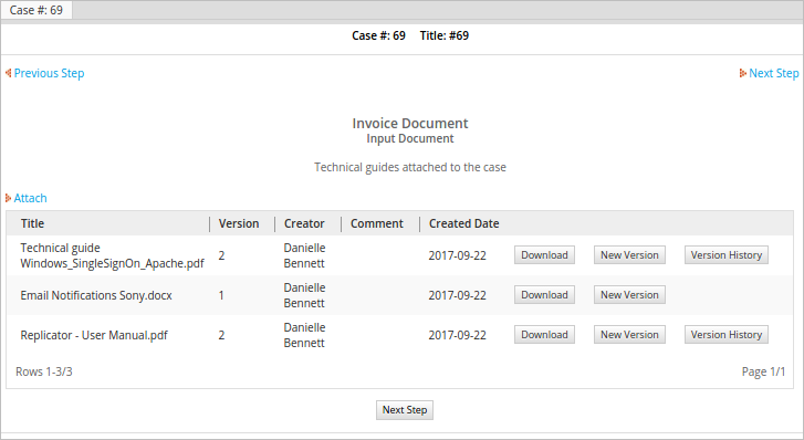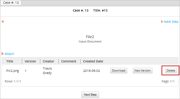 Then, open the case, click on the Steps button and select the input document in the list of steps. The input document file will be listed with a Delete button to remove it.