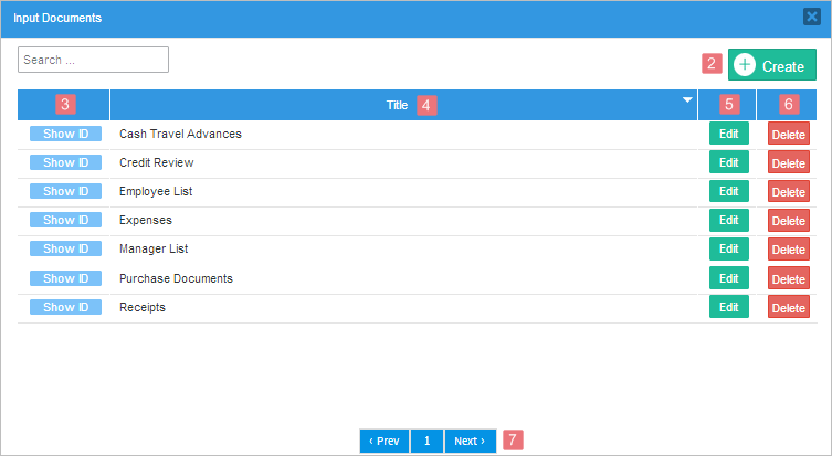 Pagination: When there are more than 10 documents created in the project, a new page is added to this window. To navigate through these pages use the > or < options. To view a specific page, click on the number of the page of this control.
