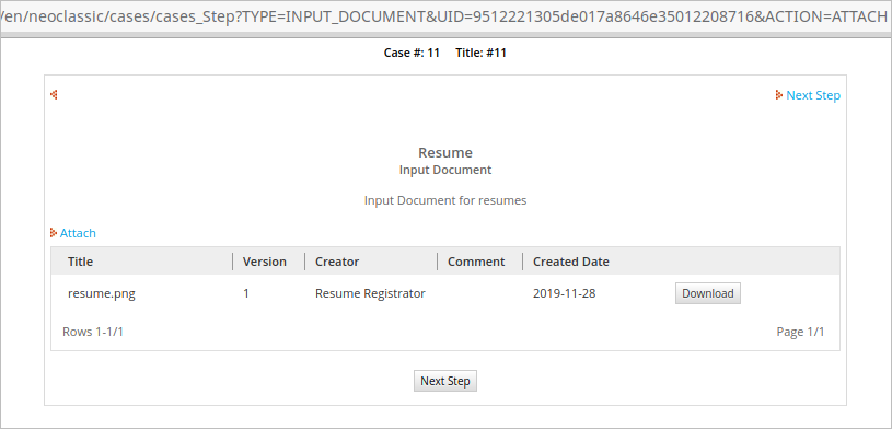 An input document (and its list of files) that has been assigned as a step in a task can be attached and reviewed with the following URL. Remember that this URL only works with the current task of the current case, as long as the currently logged-in user has the proper privileges to open the case.