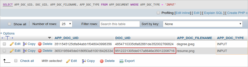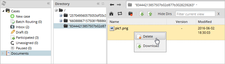 Note: When an input document file is deleted, the file remains in the server's file system and a record of the file is kept in the APP_DOCUMENT table. The only change is that its status in the APP_DOCUMENT.APP_DOC_STATUS field is changed from 'ACTIVE' to 'DELETED'.