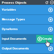 To create a new input document go to the main toolbox of the Process Map. Hover the pointer of the mouse over the + symbol next to Input Documents and click on Create. Take into account that input documents created inside a project can be used only by elements related to the same project and can not be invoked from other projects or processes.