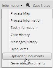To view an input document of a particular case, go to the HOME menu and open the case. Then go to the Information submenu and select the Uploaded Documents option to a see a list of available input document files.