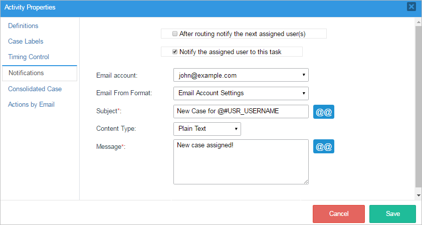 • Subject: The subject of the email message. System variables and case variables can be used in the subject of the email message by clicking the @@ button.