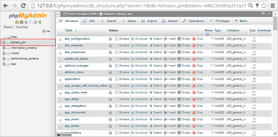 Once the user is logged in, the phpMyAdmin interface will be displayed. The ProcessMaker database created by Bitnami is named bitnami_pm by default. Select the bitname_pm database to review all ProcessMaker tables.