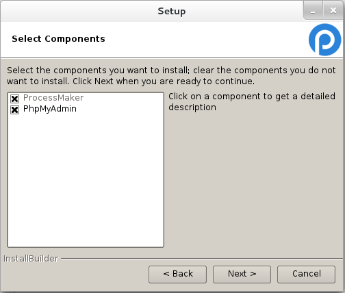 On the next screen, select the components that will be installed. By default, ProcessMaker is marked, but the installation of phpMyAdmin is optional.
