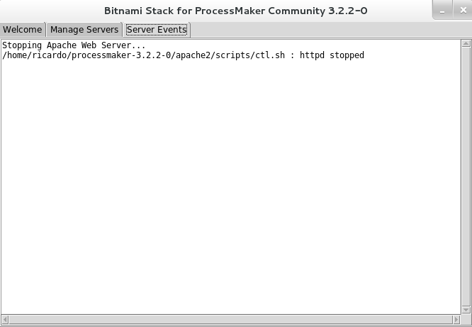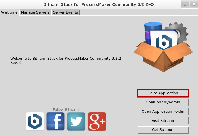Once the installation process is finished, the Bitnami ProcessMaker Stack Manager Tool will become available to manage Apache and MySQL more easily. To access ProcessMaker, navigate to the Welcome tab and click on the Go to Application button.