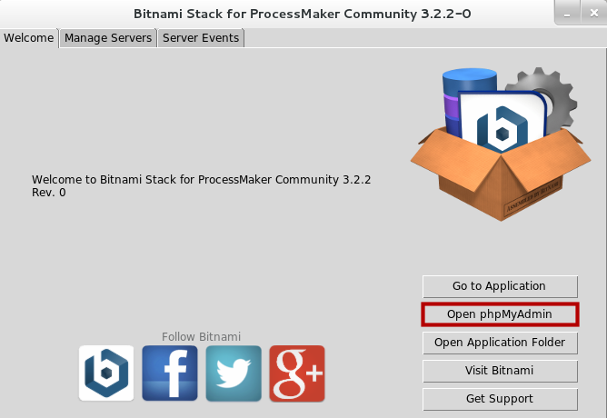 If the phpMyAdmin option was checked during the installation process in the Select the components dialog, phpMyAdmin can be accessed from the Bitnami ProcessMaker Stack Manager Tool.