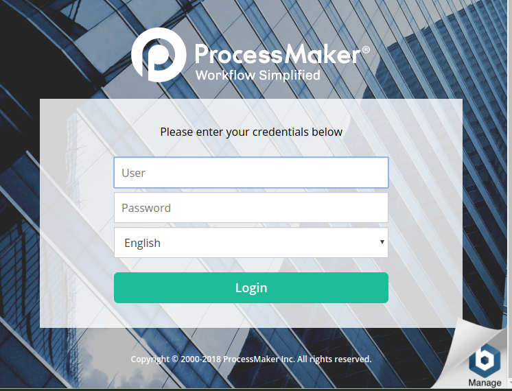 Then, enter the username and password of the Administrator user, which is "admin" by default, but a different username could have been configured in Step 4 of the installation wizard. Enter the name of the workspace that was configured in Step 4, which is named "workflow" by default, then click on Login to enter ProcessMaker.