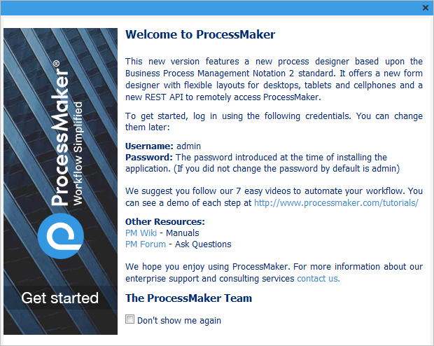 Once ProcessMaker has been successfully installed, open a web browser and go to the URL http://127.0.0.1:port/, or open the Bitnami ProcessMaker Stack Manager Tool and click on the Go to application button. The Get Started screen will appear: