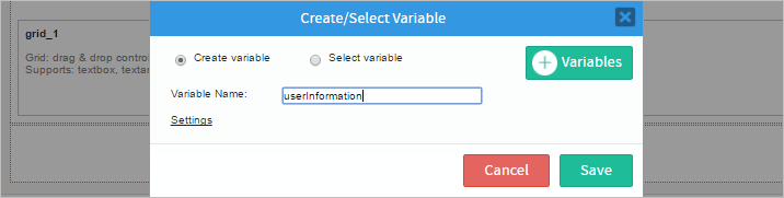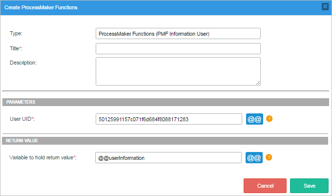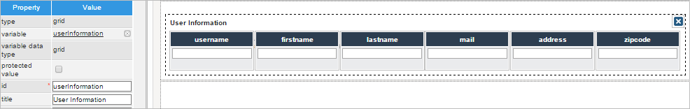 @@userInformation[1]: Name of the grid where the information will be displayed. Moreover, the grid name is defined as [1] because the return value is a grid and it has to start on 1 to display information in the corresponding fields.