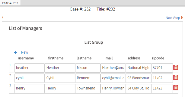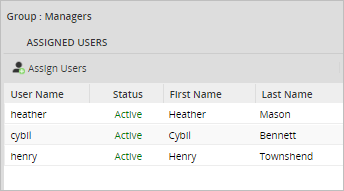 This example shows a grid in a Dynaform that lists information about the users in a group named Managers.