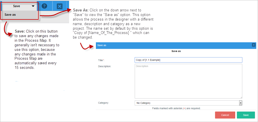 The Save and Save As options can also be found in the top toolbar. When either of these buttons are clicked, a quick message will appear at the top of the designer indicating that the process was saved successfully. If an error occurred or the session was lost while saving the process, an error message will appear at the top of the designer.