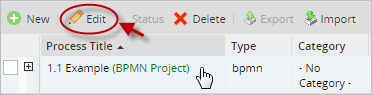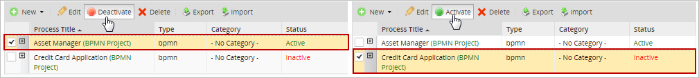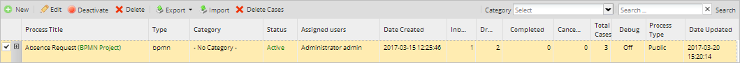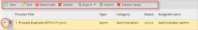 - Active: To change the status of a project to Active so cases of a process can be executed, first select the project in the list and then click on the Activate button.