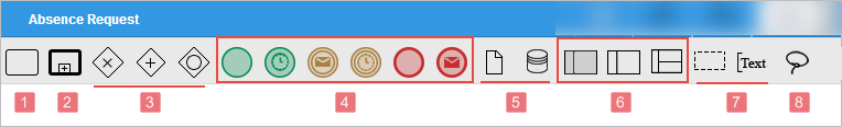 - Events: Includes the following types of events: an empty start event, a timer start event, an intermediate timer event, an intermediate message event, an empty end event, and an end message event.