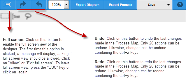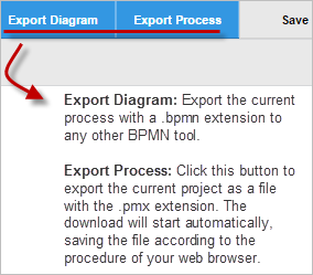 The toolbar also has two options to export both the diagram and the process. The description of both options are in the next image: