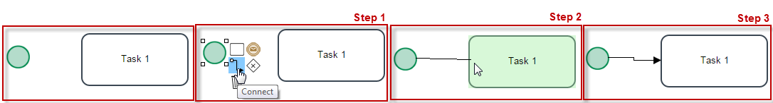 For example, when connecting a start event and a task already added to the process map, the connector between the task and the start event will be green to represent its availability to connect: