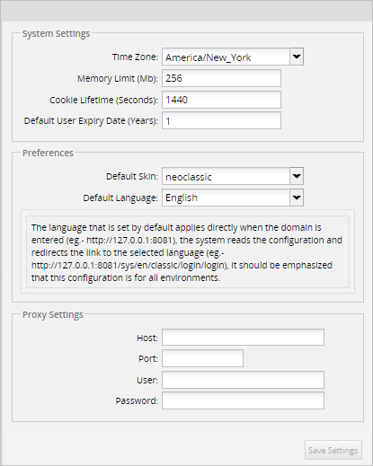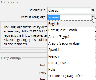 Note: The language that is set by default applies directly when the domain is entered (eg - http://127.0.0.1:8081), the system reads the configuration and redirects the link to the selected language (eg - http://127.0.0.1:8081/sys/en/neoclassic/login/login). This configuration is for all workspaces. The Default Language is the same configured in the env.ini file.
