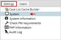 The System option under the ADMIN menu is used to configure the system where ProcessMaker is installed. Only users who have the permissions: PM_SETUP, PM_SETUP_ADVANCE, PM_USERS and PM_SETUP_USERS_AUTHENTICATION_SOURCES assigned to their role to have access to this option.