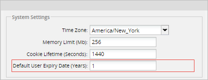 Set the time (years) of the expiry date of the users. When a user is created, the system will automatically set their "Expiration Date" adding this value to the creation date. By default, this value is set to 1 year.