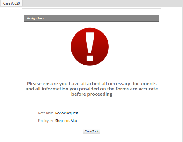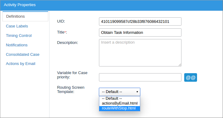 • Task Properties: Templates are used in the Notifications property of the tasks to send a notification to the user(s) assigned to the next task in a case or to the user assigned to the current task. To access this property, right click on a task to access its context menu and select the Properties option.