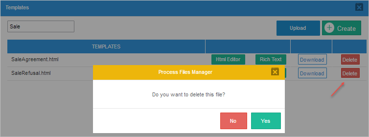 8. Delete: Click on this button to delete the template. A message box opens to ask if the template should be deleted. Click on NO to close the message box and return to the Template list without deleting the template. Click on Yes to delete the template and a flash message will be shown at the top part of the process map confirming the deletion of the template.