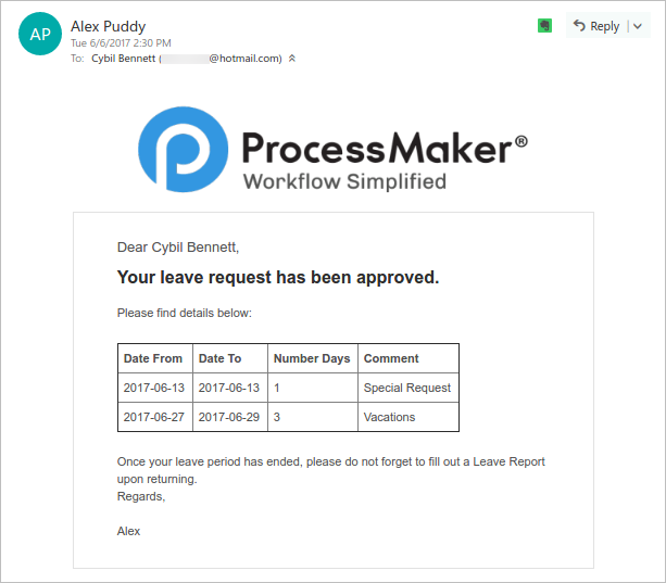 Your leave request has been approved. Please find details below: