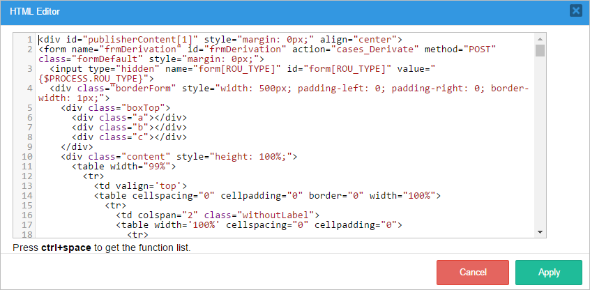 The cases_ScreenDerivation.html file also contains variables that are extracted from ProcessMaker variables. Once the new template is created, it's not necessary to save it in the above file path. It can be uploaded directly through the Templates option in the main toolbox.