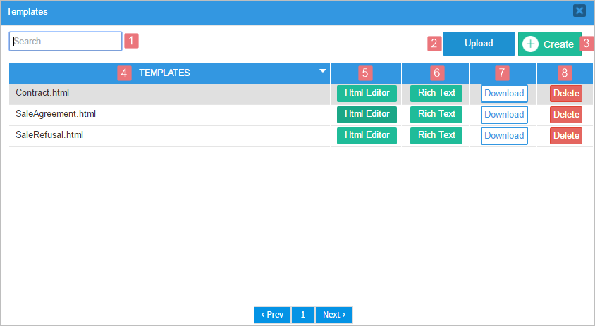 4. Templates: This column lists the names of the templates already created or uploaded in the process. Click on the arrow at the right side of the name of the column to sort the list in ascending or descending order. Notice that all the templates are shown with the .html file extension.