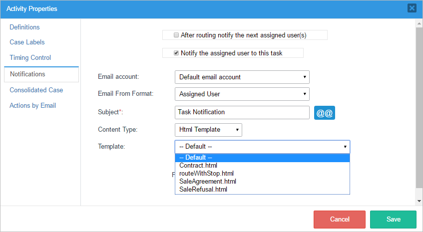 Once inside this option, check the After routing notify the next assigned user box and/or the Notify the assigned user to this task box, then write the subject of the email in the Subject field. In the Content Type field, select the option HTML Template and a dropdown list of already created templates will appear next to the Template field.