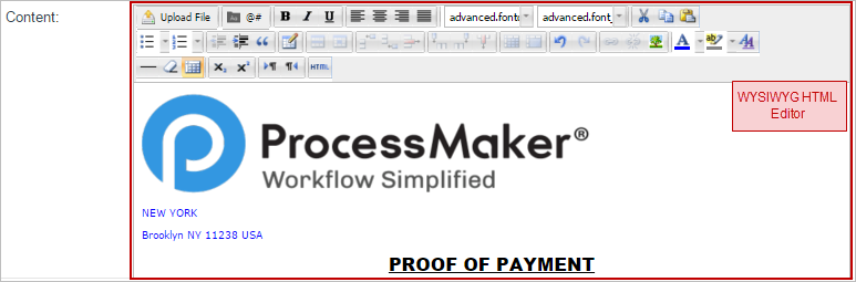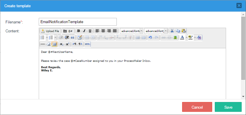 Email template files can be created inside ProcessMaker with the limited HTML editor or the helpful WYSIWYG editor. For greater creativity, create the template file with an external text editor and then upload it to ProcessMaker.