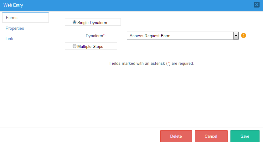 Single Dynaform: Choose this option to select only one Dynaform from the Dynaform dropdown. The user will be redirected to this specific Dynaform when accessing the Web Entry link.